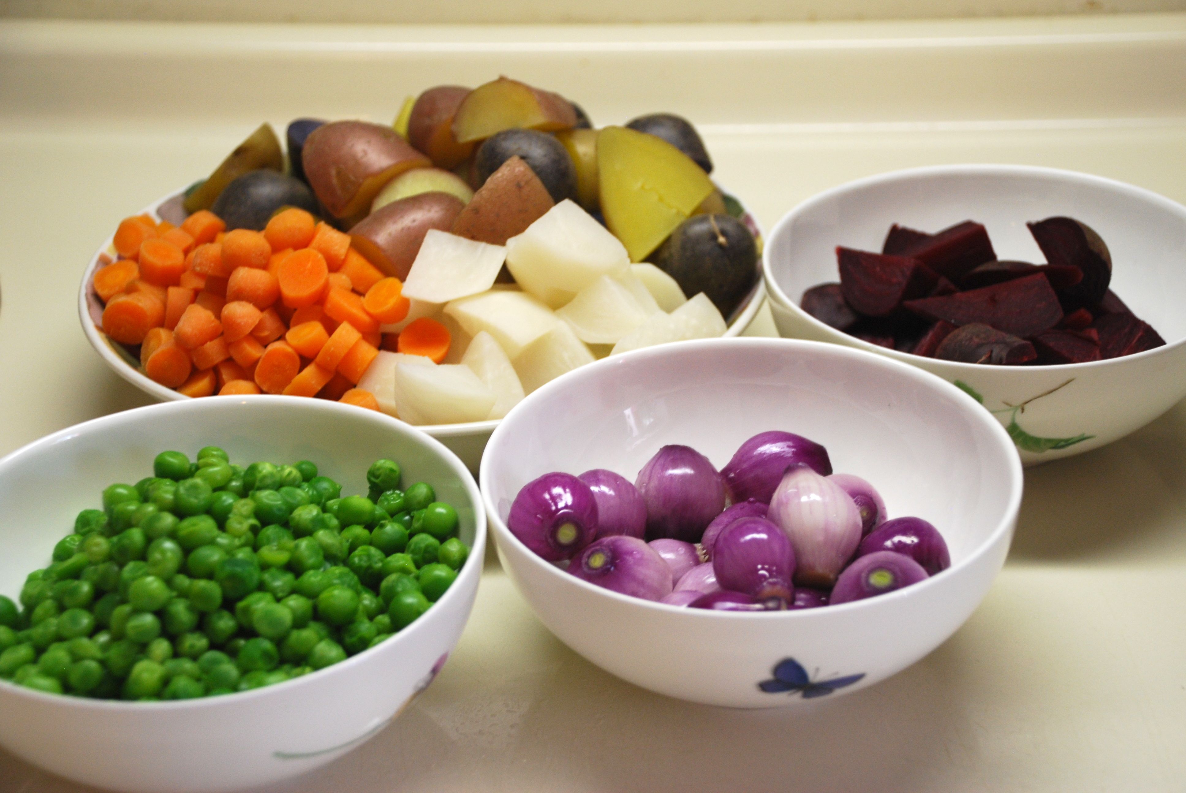 PAR COOK VEGGIES: Bring a large pot water to a boil. Assess which vegetables bleed in color (like beets) or have a strong flavor (like pearl onions).