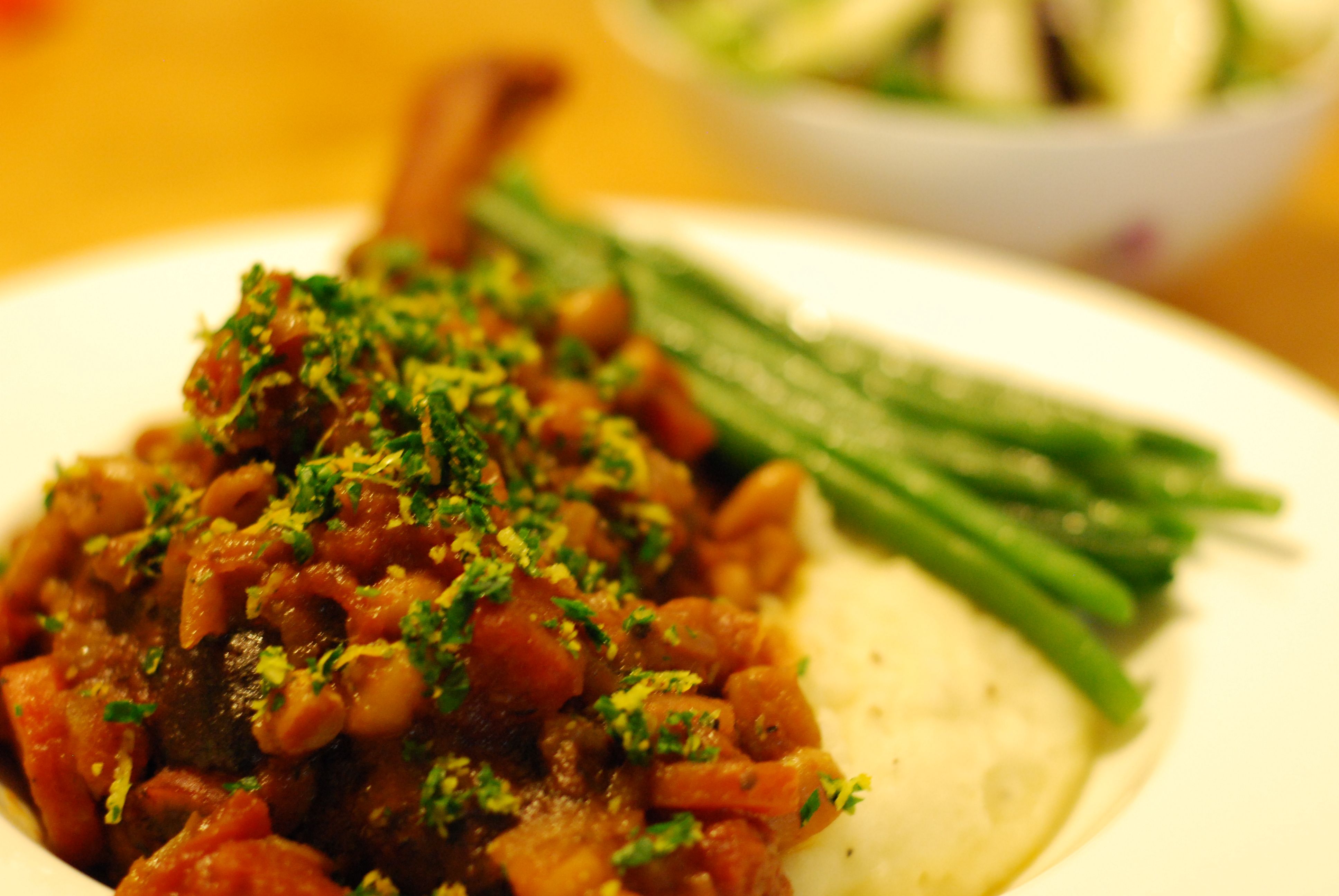 Comments on serving: After braising for 3 hours the meat will melt off of the bone but it will usually stay on the bone until gently pulled off with your fork. I generally estimate one shank per person, although if they are a full pound per shank it will probably be more than one average person can eat. The presentation of a whole lamb leg smothered in the braised beans and veggies, sprinkled with the colorful Gremolata is simply tantalizing. But sometimes it is more practical to pull the meat off the bone and serve it like a stew. Either way, its flavor will linger on your tongue and create fond memories.
