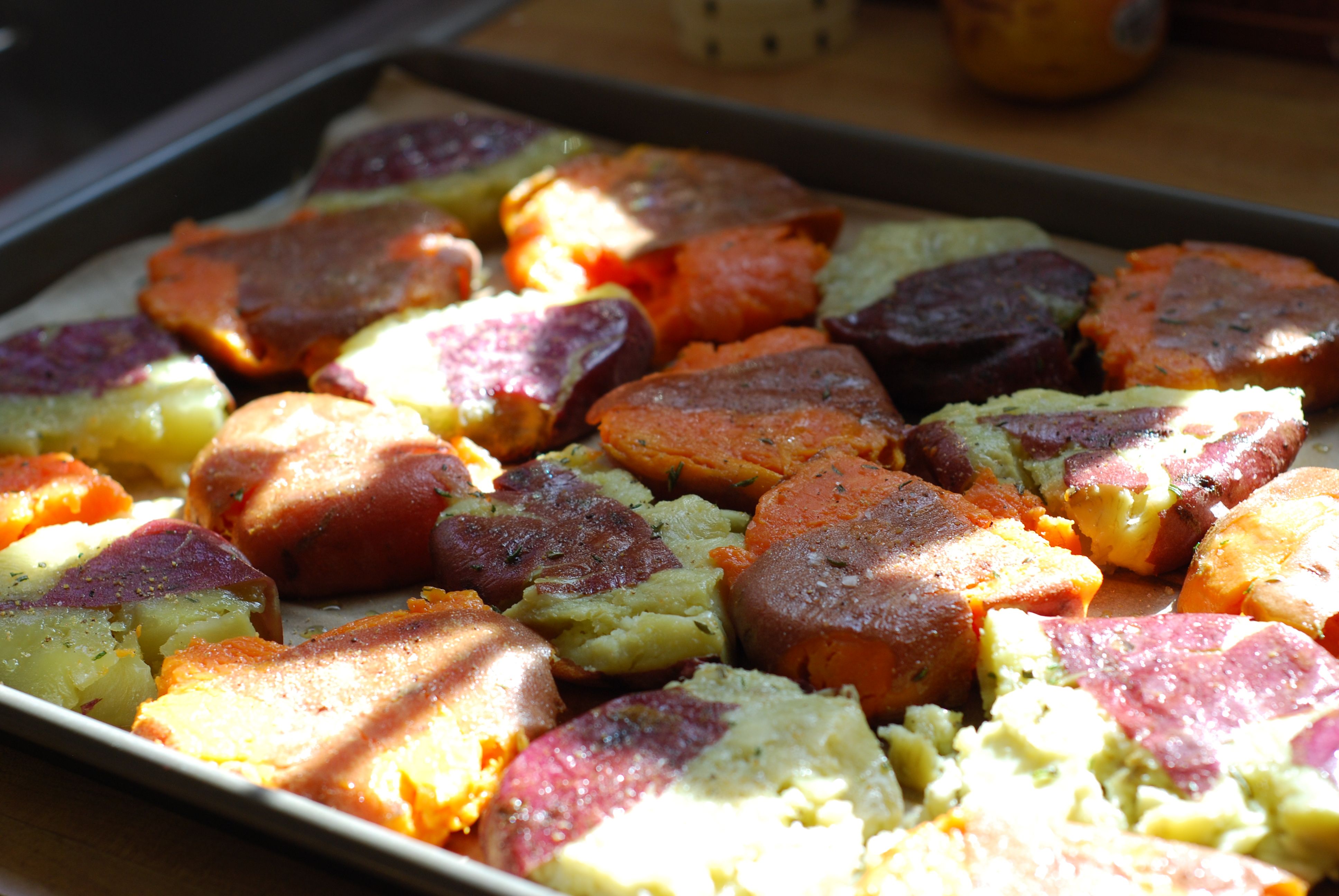 This recipe works well with any type of baby potato or sweet potato. What is so stunning about this simple, twice-cooked potato dish is the colors.