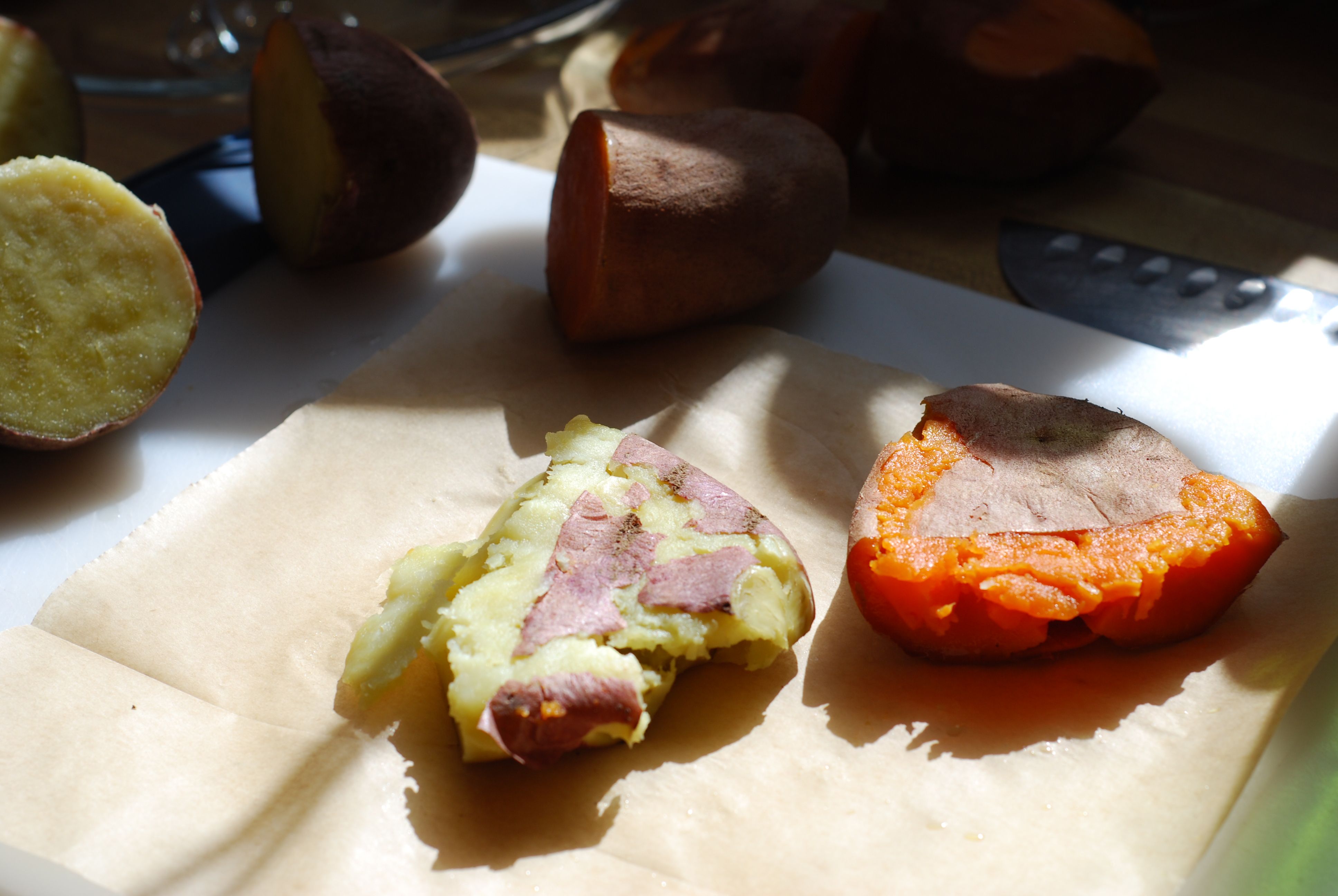 Garnet Yams have dark red skin and bright orange flesh. Japanese Sweet Potatoes have deep burgundy skin with a pale yellow flesh.