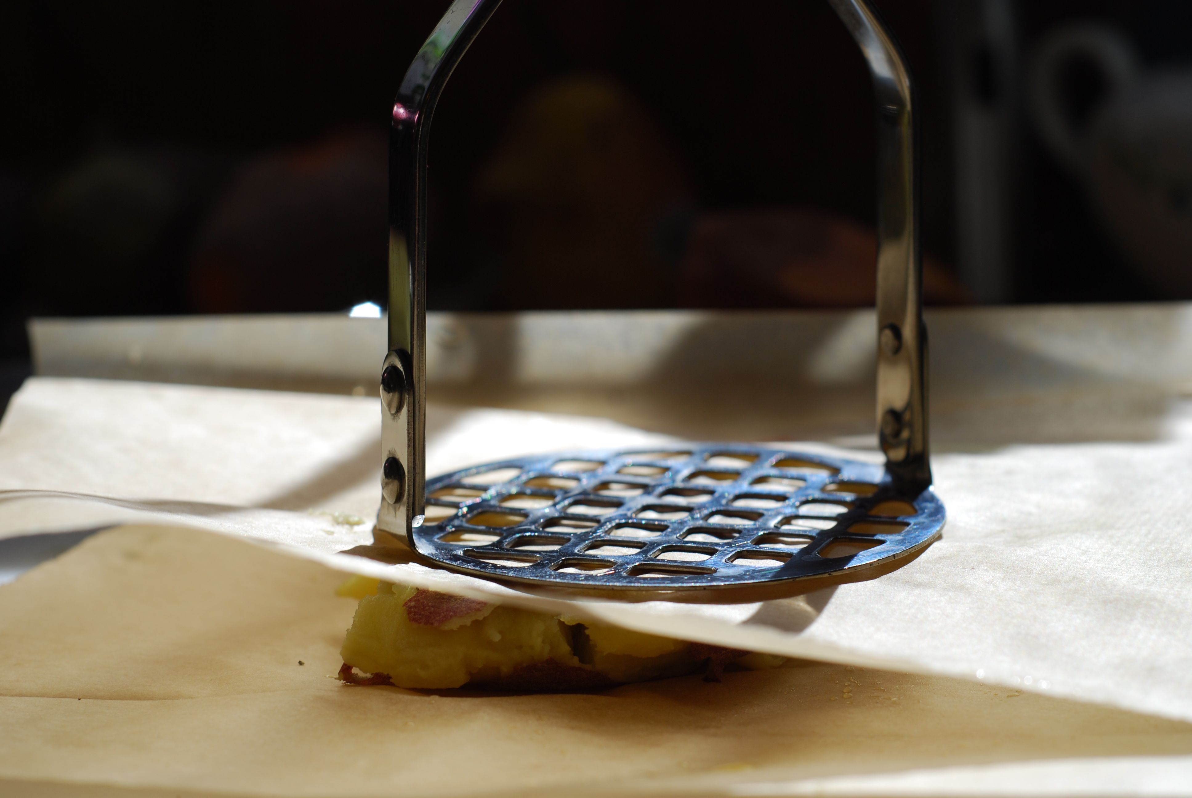 Smash the potatoes – Cut two squares of parchment paper about 7×7. Place one potato between the paper sheets. Using the palm of your hand or if you have a potato masher with a flat surface, press down on potato until it is 1-inch to ¾ of an inch thick.
