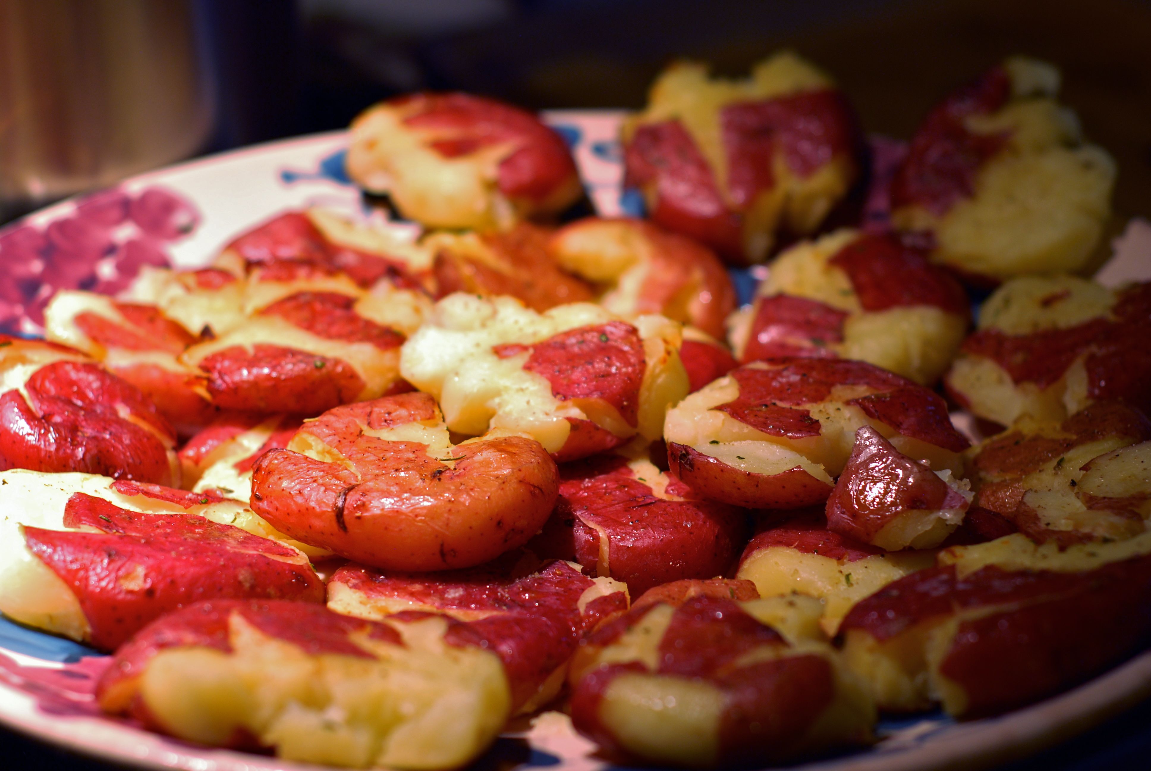 Yes, that’s smashed not mashed. Not only is this recipe delicious but it is a beautiful side that your guests will be talking about over and over again. Rosemary Garlic Olive Oil fills the potatoes with great flavor but you can use plain olive oil if the taste will compete with your main course.